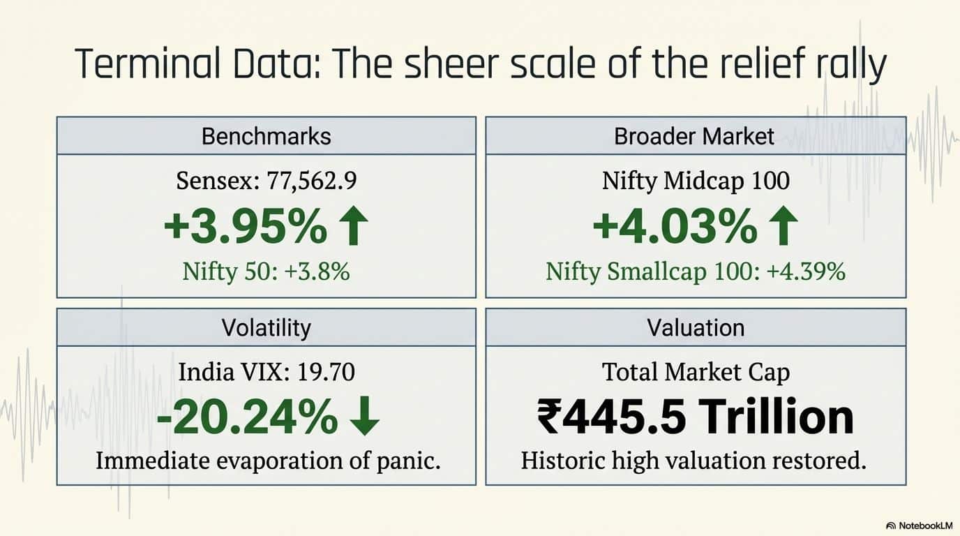- Sensex: 77,562.9 (+3.95%)