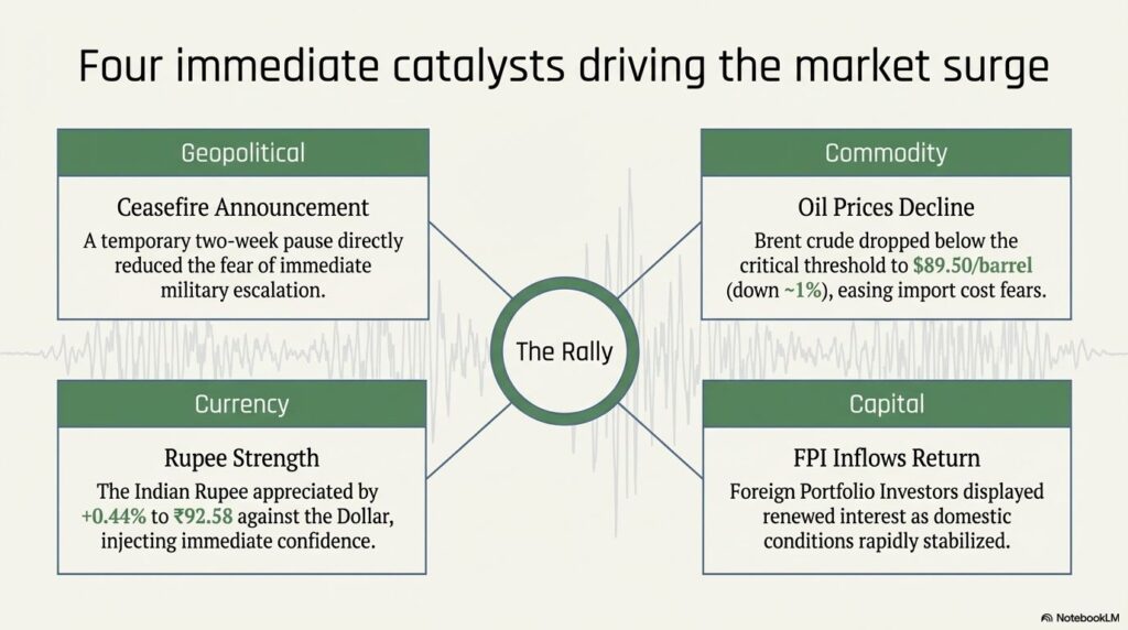 Indian equity markets witnessed a massive relief rally, with the Sensex jumping nearly 4%, marking its strongest session in over five years. This surge came after news of a two-week ceasefire between the United States and Iran, which temporarily eased fears of disruption in global oil supplies.